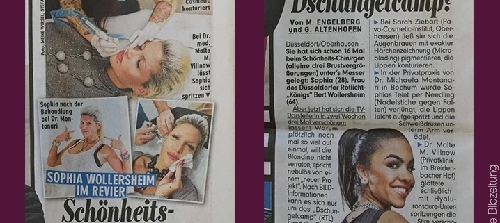 “Düsseldorf/Oberhausen – Sie hat sich schon 16 Mal beim Schönheits-Chirurgen (alleine drei Brustvergrößerungen) unter´s Messer gelegt: Sophia (28), Frau des Düsseldorfer Rotlicht “Königs” Bert Wollersheim (64). [..] Bei Sara Ziebart (Pavo Cosmetic Institut, Oberhausen) ließ sie sich die Augenbrauen mit exakter Härchenzeichnung (Microblading) pigmentieren, die Lippen konturieren.” Quelle Bildzeitung