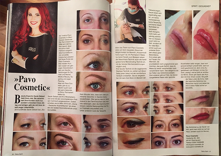 Auszug: “Beauty-Expertin Sarah Ziebart liebt ihren Job. Sie verschönert ihre Kunden nicht nur, sondern erleichtert ihren Alltag und einigen gibt sie mit ihrer Arbeit sogar Lebenshilfe. 2010 eröffnete Sarah Ziebart das „Studio“ Institut Pavo Cosmetic in Oberhausen-Sterkrade. Der Terminkalender füllte sich dermaßen rasant, dass sie schon bald mehrere ausgebildete Kosmetikerinnen einstellte. Inzwischen arbeiten fünf feste Profis bei Pavo Cosmetic. Die meisten Kunden nutzen die gängigen Dienstleistungen wie Hautbehandlungen für Damen und Herren, Medical Beauty, Sugaring und sogar Piercing.