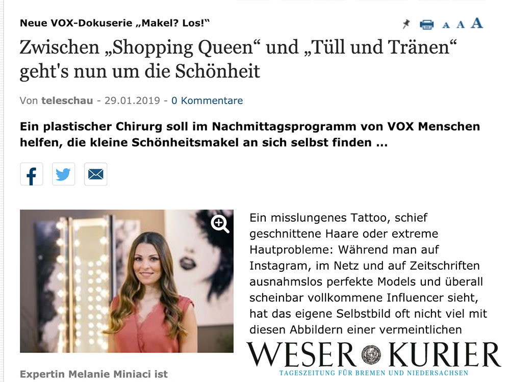 Der Weser Kurier berichtet über die neue VOX Sendung Makel Los, in der auch Sara Pavo und unsere liebe Melanie Miniaci zu sehen sind. Schau’ doch mal rein! Die Sendung läuft ab dem 04.02.2019 Montags – Freitags um 16 Uhr. Hier geht es um Artikel des Weser Kuriers: